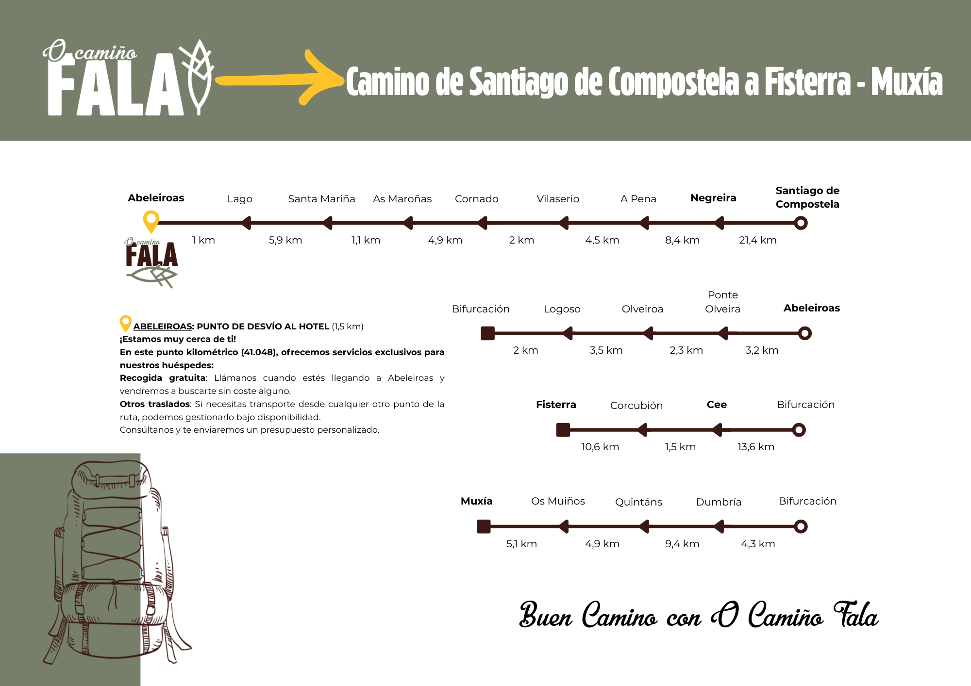 Le acompañamos en cada paso en el Camino de Santiago a Fisterra. Nuestro equipo está a su disposición para ayudarle a organizar su experiencia de forma cómoda y segura. Desde traslados y coordinación de servicios de transporte hasta cualquier otra necesidad logística, nos encargamos de todo para que solo tenga que disfrutar del Camino.